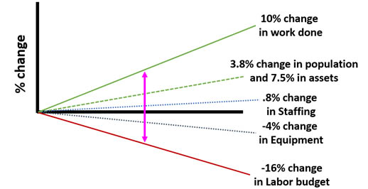 In 10 years, the County is doing 10 percent more work, while the labor cost is 16 percent less. The difference in the purple line in Figure 2 is savings of 26 percent through a combination of lower costs and getting more accomplished (greater productivity). It should also be noted that if staffing was only linked to population, the amount of staff is 3 percent (3.8 to 0.8 percent) less than would be expected and, if linked to assets to be maintained, it would 6.7 percent (7.5 to 0.8 percent) less than expected. The 26 percent savings precludes the 4.5 percent reduction in equipment. This improvement is further demonstrated in Figure 2.