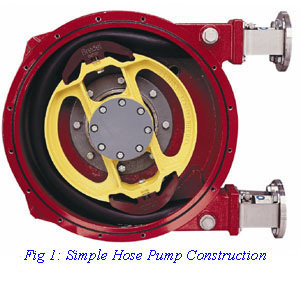 Hose pumps are unique in that there are no seals, valves, or moving parts in the product stream, making the pump ideal for abrasive slurries. The pump's operation is elegantly simple: a hose element positioned along stationary pump housing is compressed from the outside by shoes that are mounted to a rotor. (Figure 1) Fluid is pushed towards the discharge as the rotor slides the shoes along the hose element while the restitution of the hose element behind the shoe allows more fluid to be drawn into the pump. This design means the abrasive fluid is completely contained within the hose element; the rotor remains outside the pumpage zone and never actually touches the product being moved. The complete closure of the hose element gives the pump its positive displacement action, preventing flow drop or erosion from backflow and also eliminating the need for check-valves.