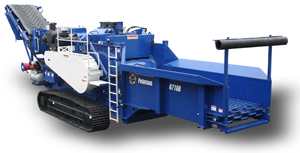 Eugene, OR The Peterson model 6710B Track Mounted Horizontal Grinder is the newest model in Peterson's popular line of Horizontal Grinders. Powered by a 1000-horsepower Caterpillar 3412E diesel engine, the 6710B is designed for the biggest jobs. With a feed opening of 50 x 66 inches, the 6710B can even process large stumps that used to be reserved for tub grinders! The grinder is particularly suited for land clearing operations or other applications where mobility is desired. A track mounted Horizontal Grinder also reduces material handling costs in conventional recycling yards, as well.